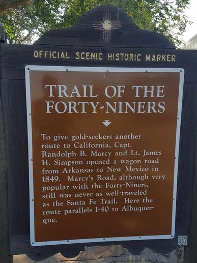 The inscription reads “To give gold-seekers another route to California, Capt. Randolph B. Marcy and Lt. James H. Simpson opened a wagon road from Arkansas to New Mexico in 1849. Marcy’s Road, although very popular with the Forty-Niners, still was never as well-traveled as the Santa Fe Trail. Here the route parallels I-40 to Albuquerque.”